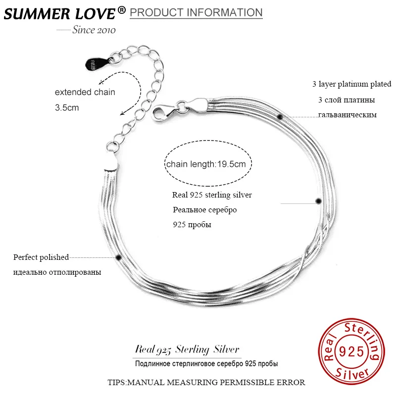 Brand Name: SUMMER LOVE Item Type: S925 sterling silver jewelryMaterial: Pure 925 Solid Silver (If not,full refund)Size:19.5cm+3.5cm(extended chain)3 line chain weight:2.25g5 line Party/Events/Daily Wear/Anniversary/Gift