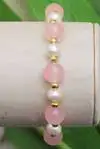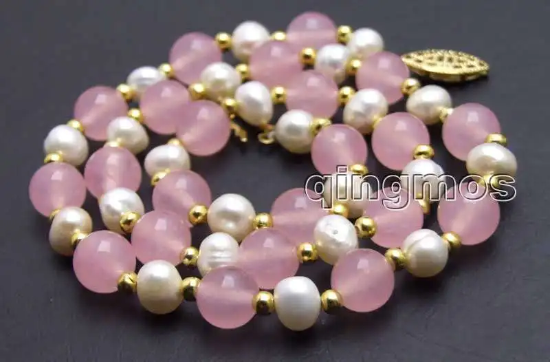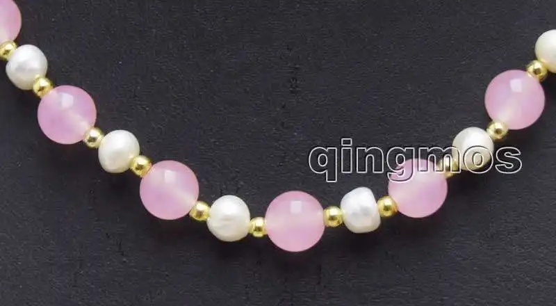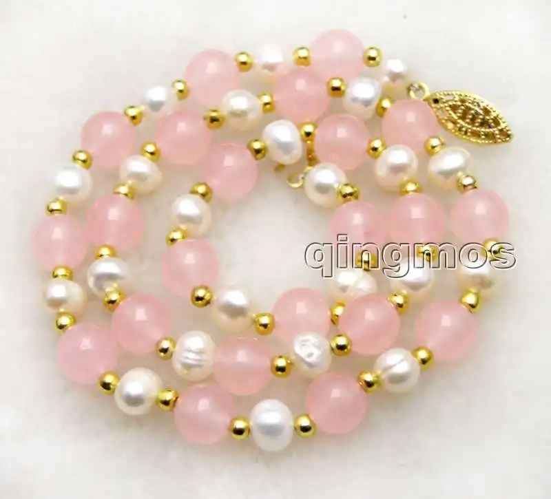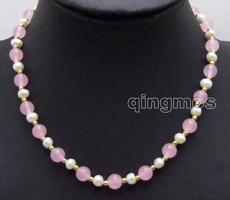 SALE 6-7mm White Natural freshwater Pearl & 8mm Round Pink Jade 17'' Necklace -nec6051