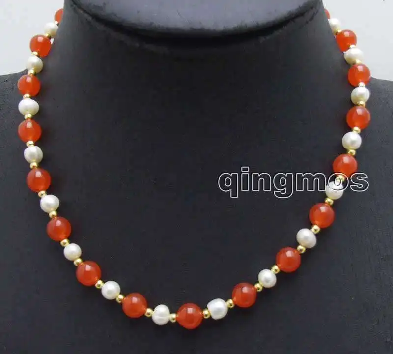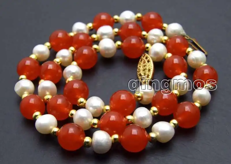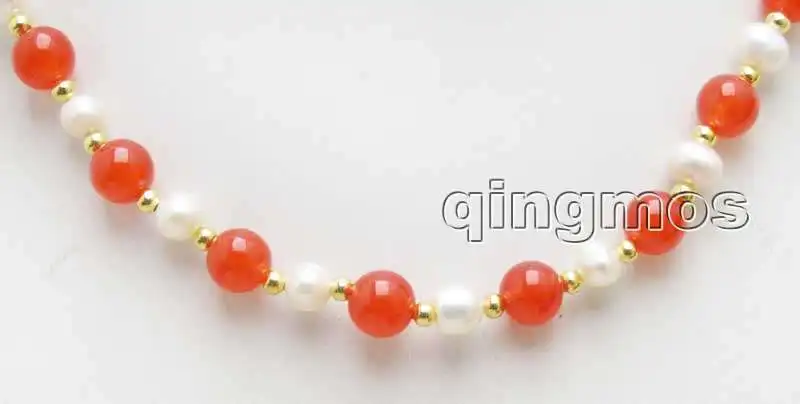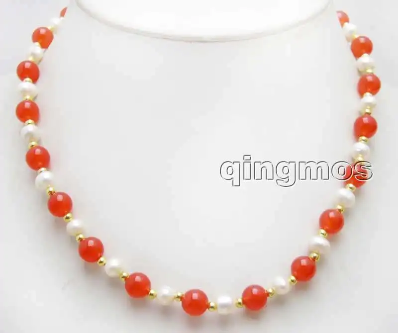 SALE 6-7mm White Natural freshwater Pearl & 8mm Round china red Jade 17'' Necklace -nec6050