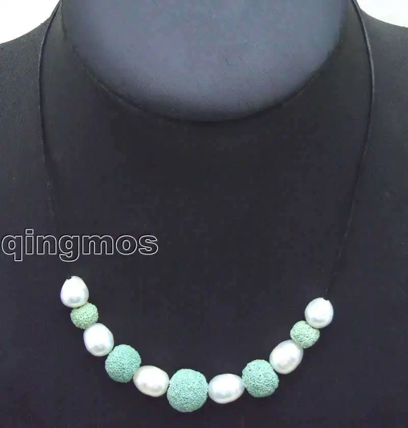 SALE Big 10-11mm White Rice Natural Freshwater Pearl with Green Lava rock Necklace 18" with Genuine Leather-5907
