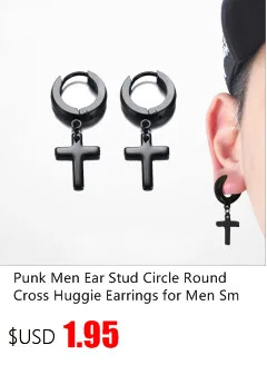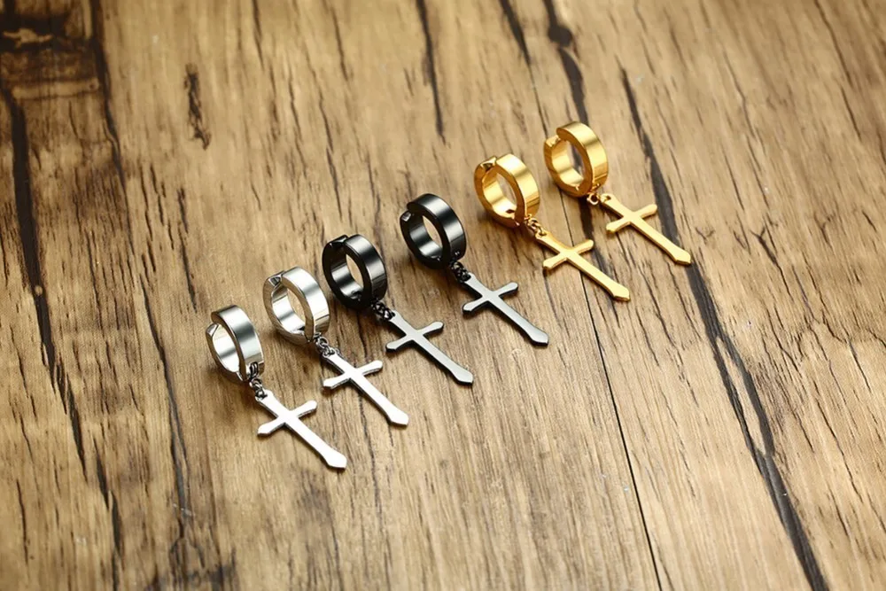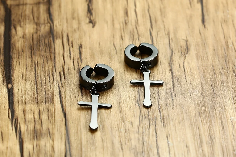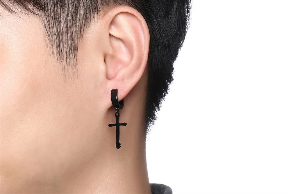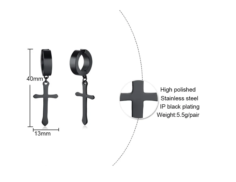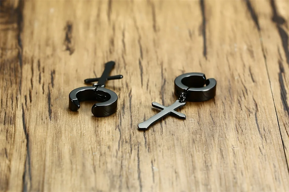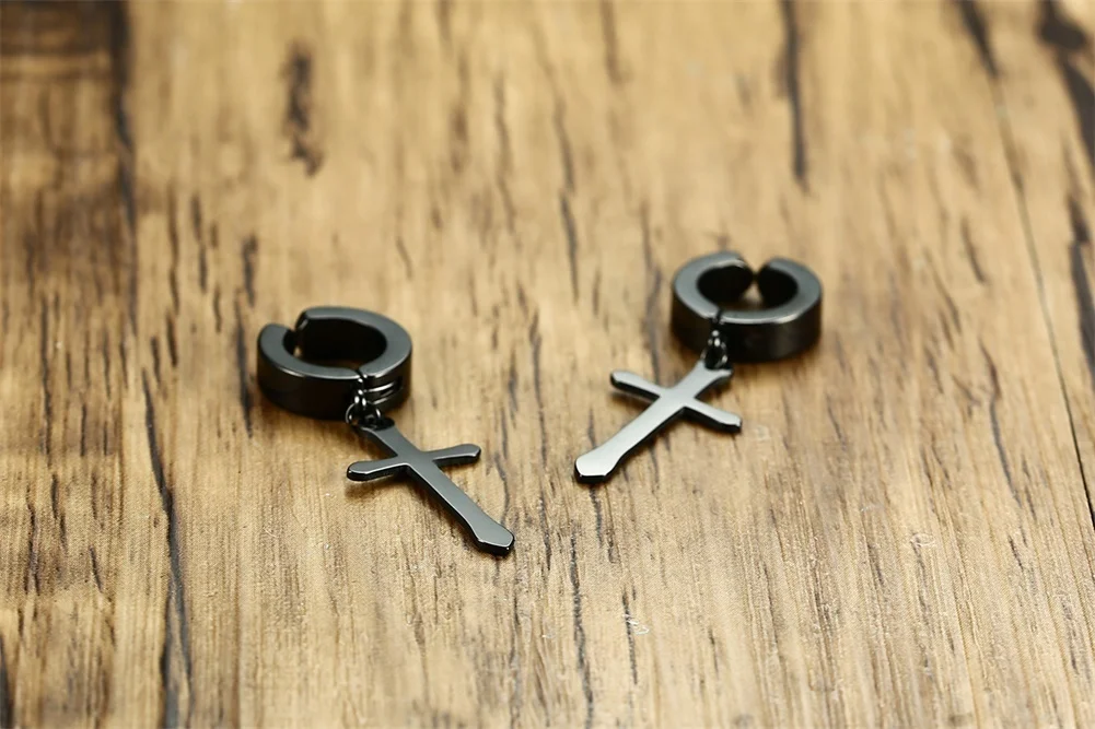 1 Pair Men's Cross Hoop Earrings In Black Stainless Steel Crucifix Drop Huggie Hinged Earings Male Jewelry