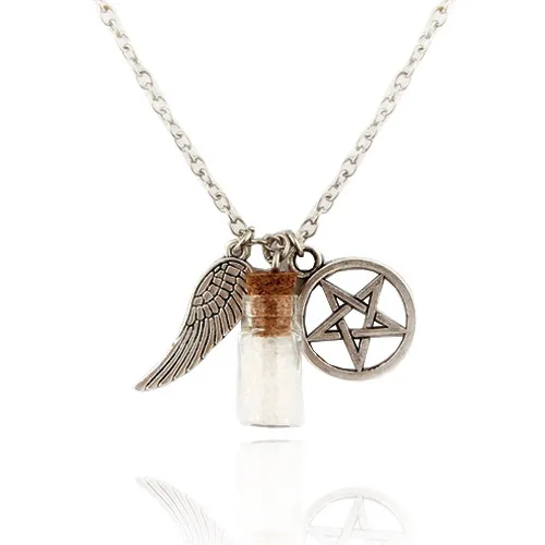 1pcs Silver Tone Supernatural Protection Necklace Angel Wing Pentagram With Salt Bottle Pendant Chain Necklace