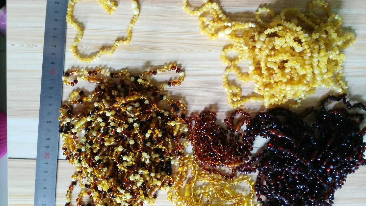Type: Hand made Baltic amber baby teething necklace with knots and screw clasp It's a natural analgesic, it helps calm a baby. Item designed for boys and girls. Made of rounded cherry, cognac, honey, lemon amber beads.