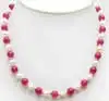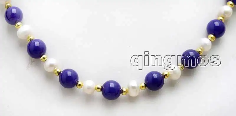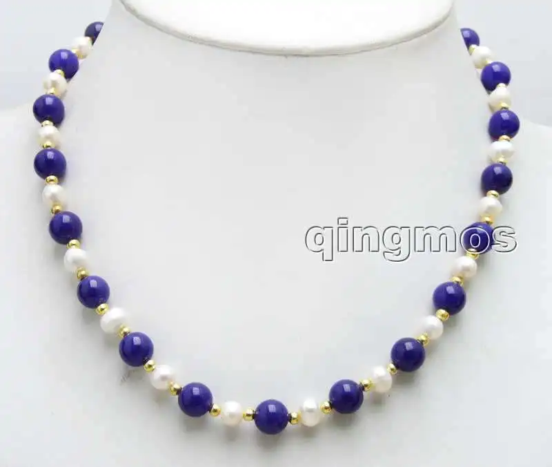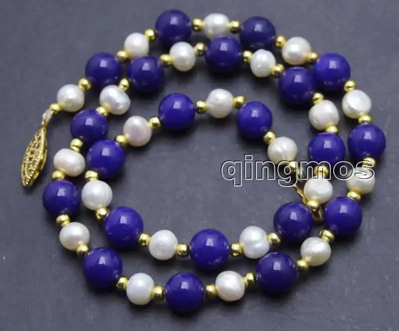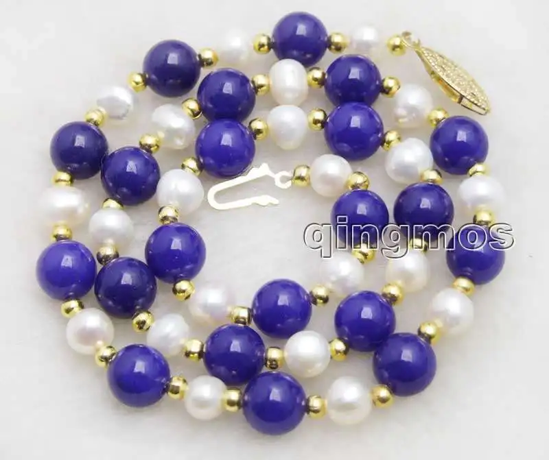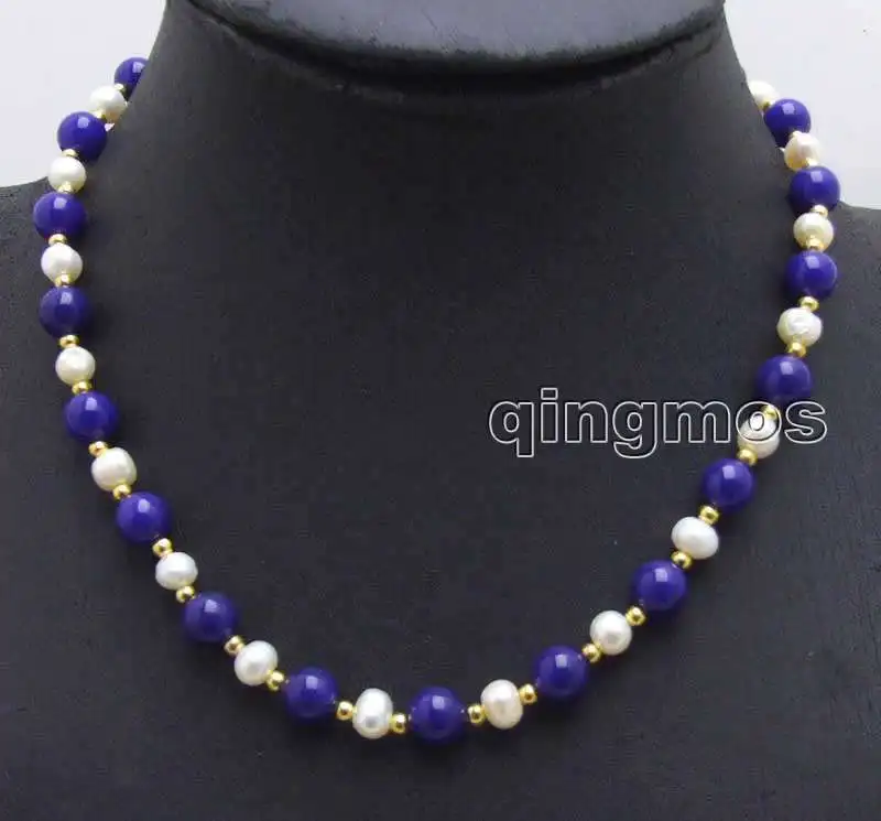 SALE 6-7mm White Natural freshwater Pearl & 8mm Round Blue Jade 17'' Necklace -nec6047