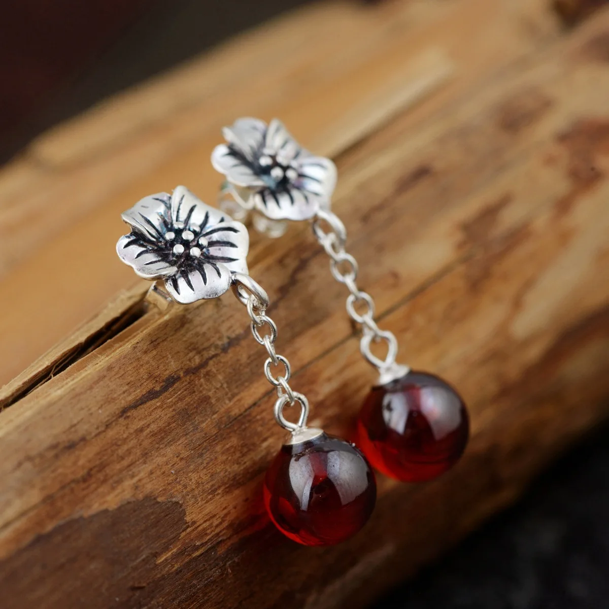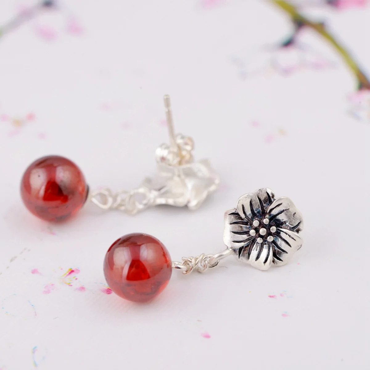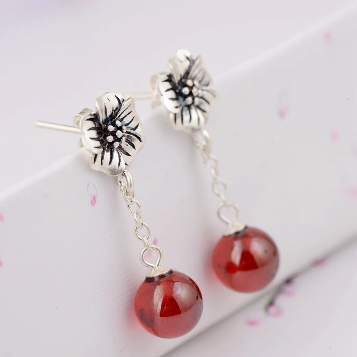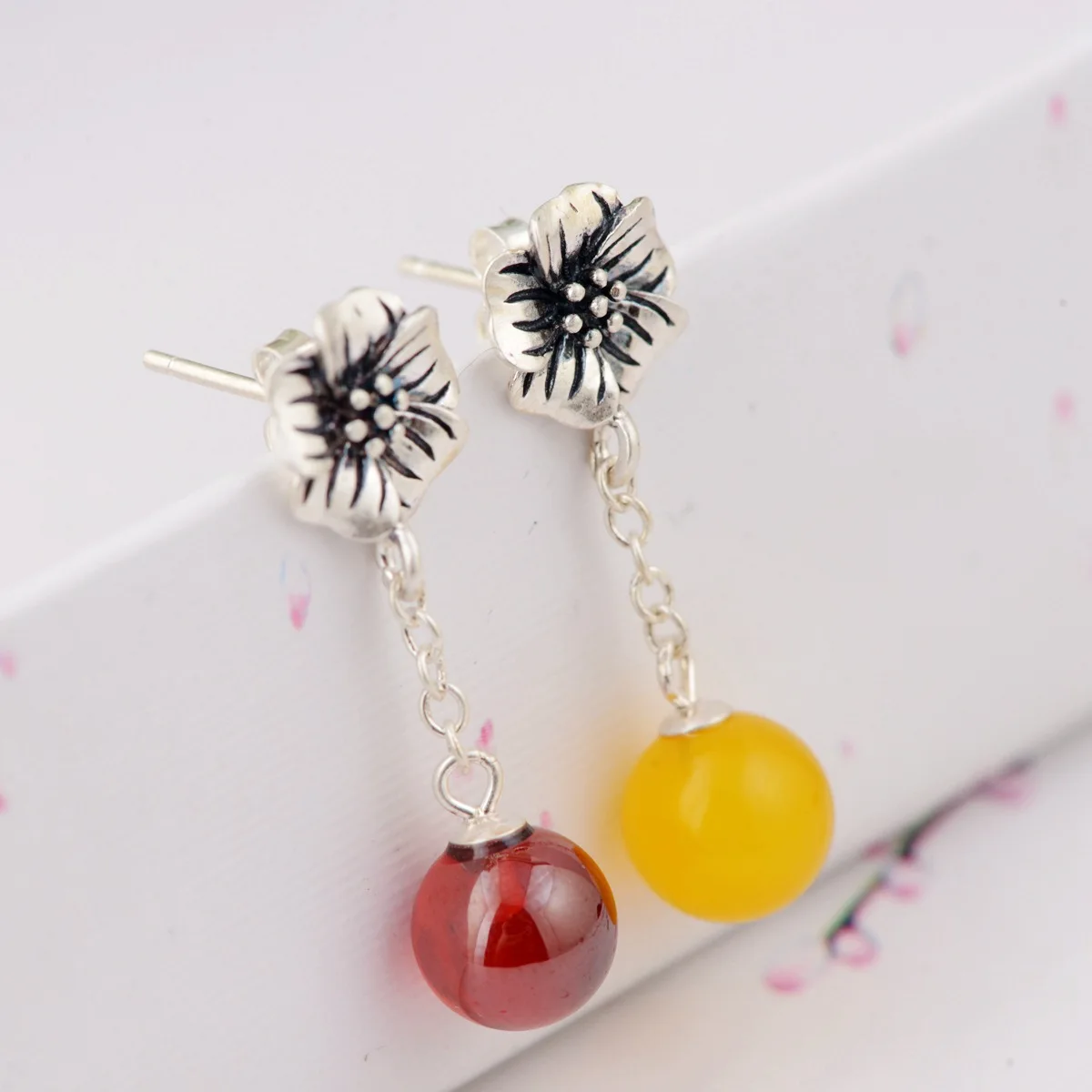 990 Sterling Silver Jewelry Natural Stone Flowers Drop Earrings For Women With Yellow Chalcedony And Red Garnet