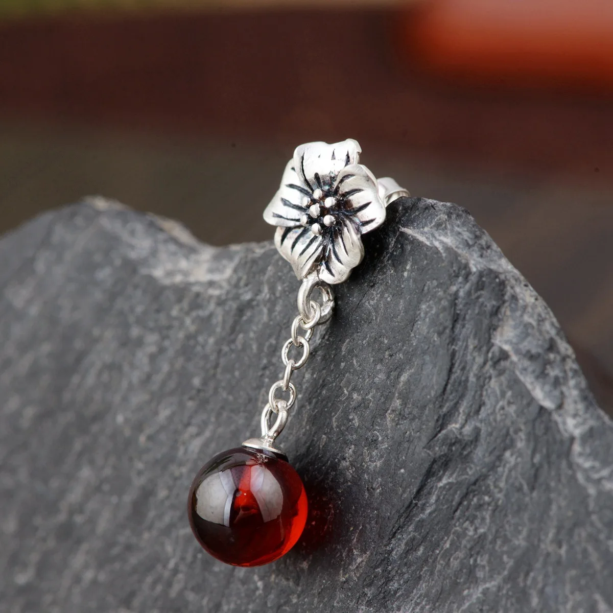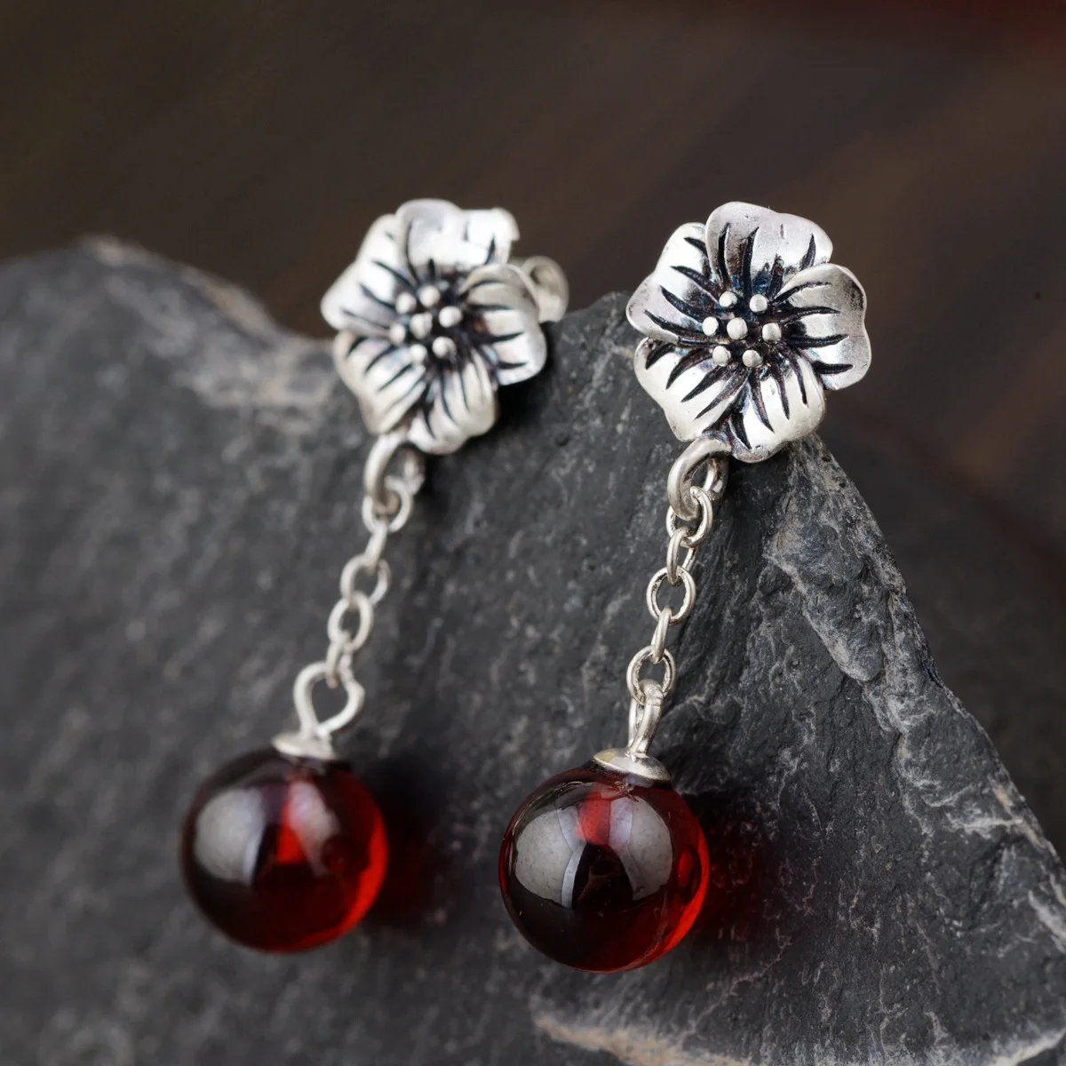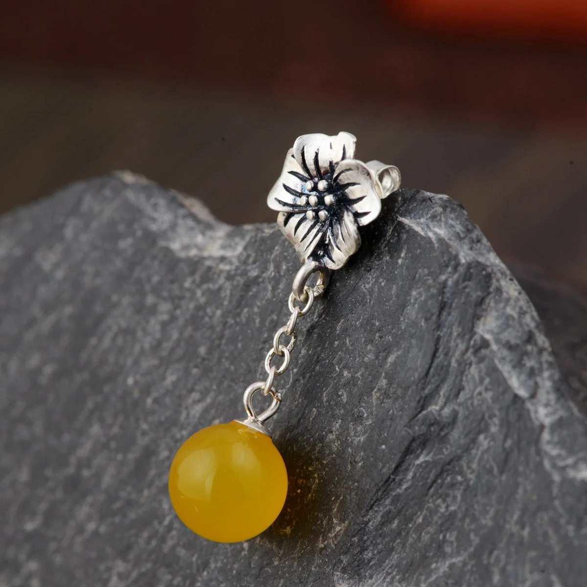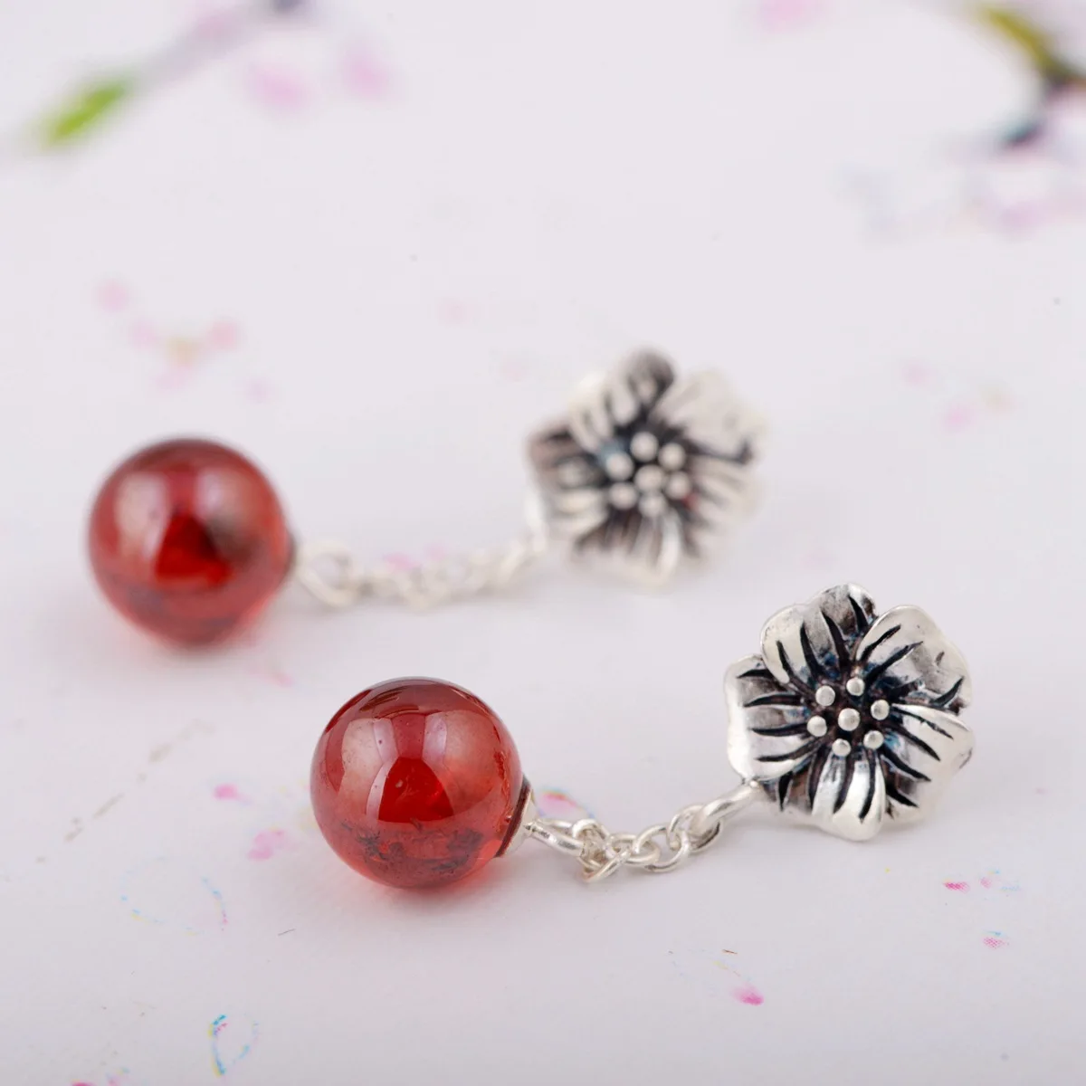 990 Sterling Silver Jewelry Natural Stone Flowers Drop Earrings For Women With Yellow Chalcedony And Red Garnet