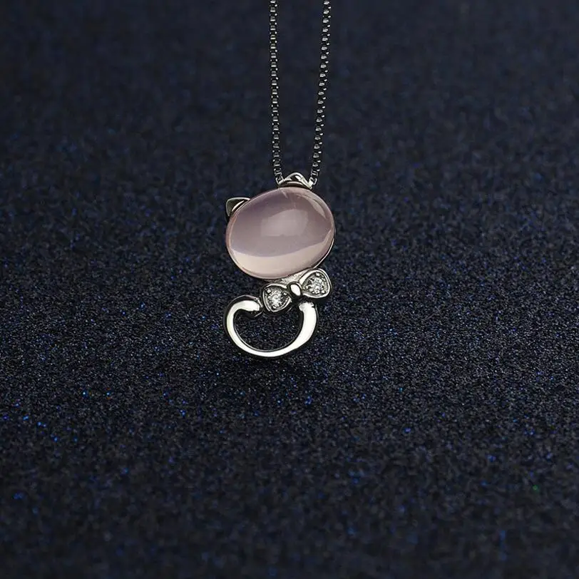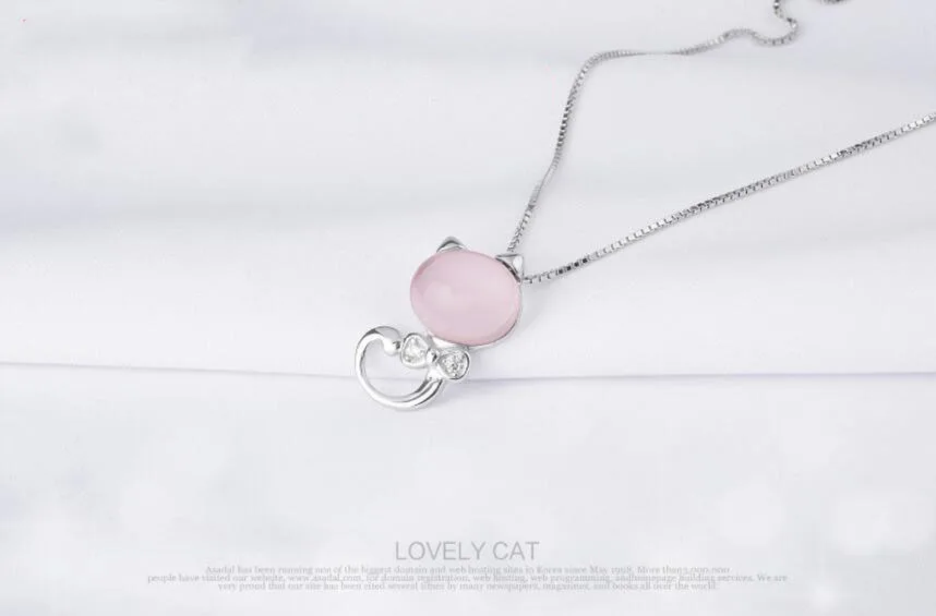 Anenjery 925 Sterling Silver Pink Moon Light Stone Cat Pendant Neckace For Women Gift 45cm Box Chain collares kolye S-N75