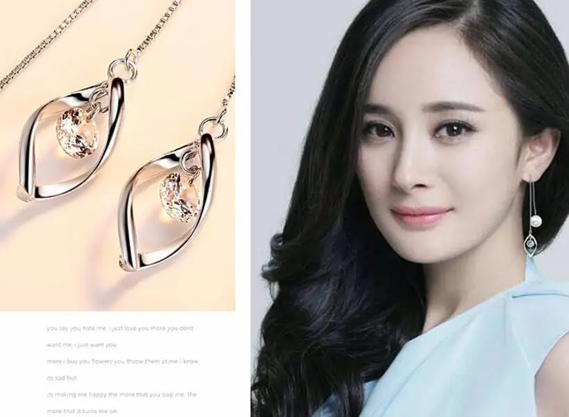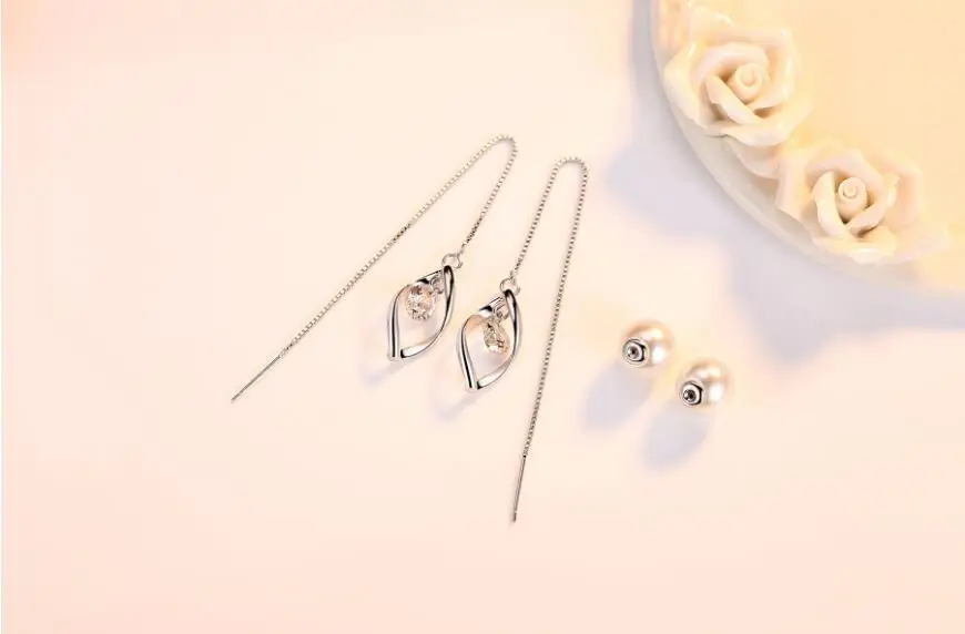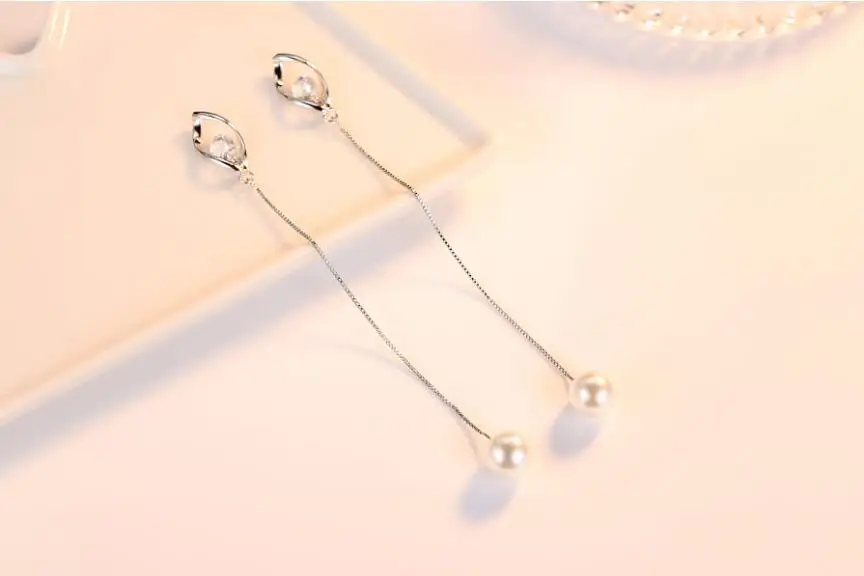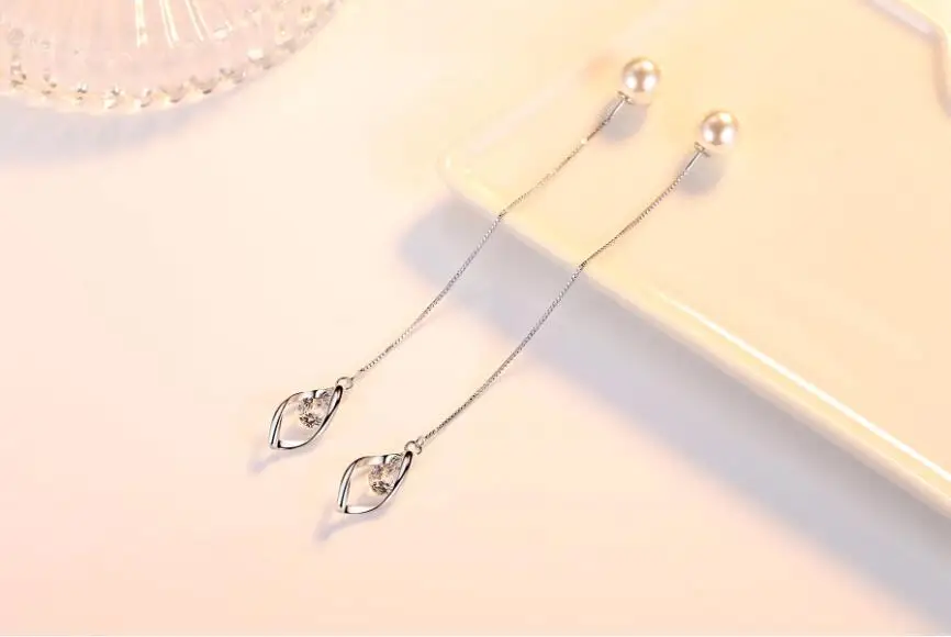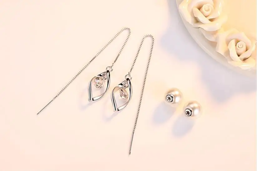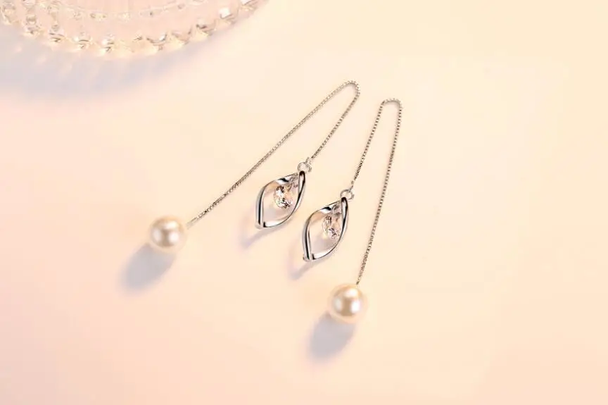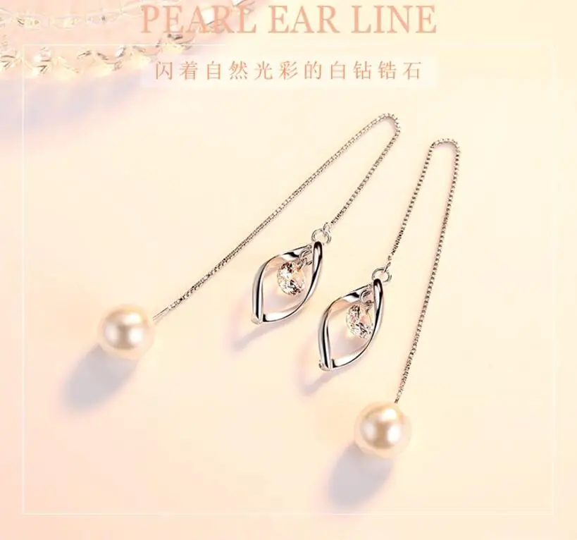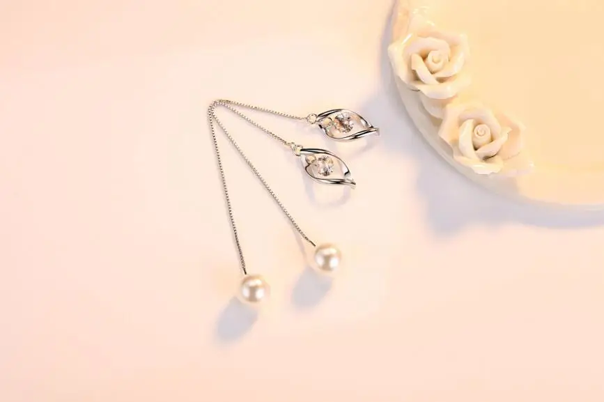 Anenjery Newest pendientes 925 Sterling Silver Twist Zircon Pearl Long Tassel Ear Line Drop Earrings For Women oorbellen S-E311