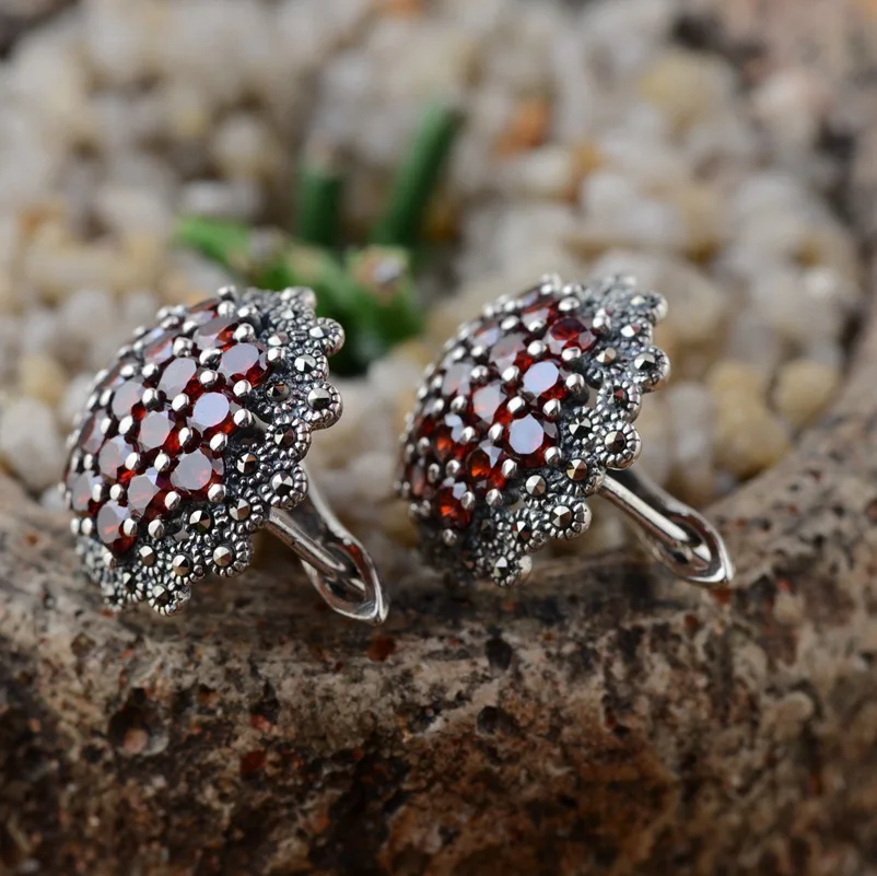 BALMORA 100% Real 925 Sterling Silver Jewelry Red Garnet Retro Elegant Stud Earrings for Women Lover Party Gifts Aretes SLS30192