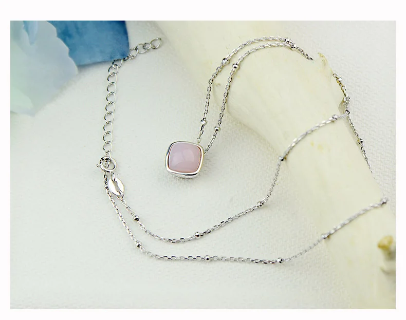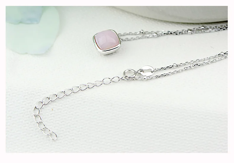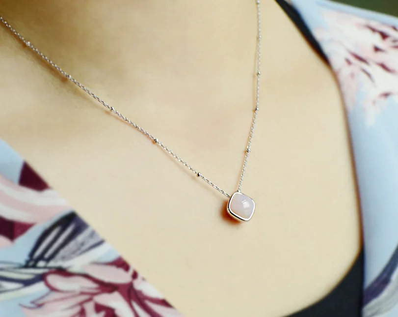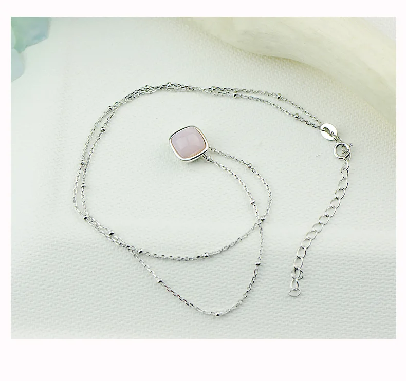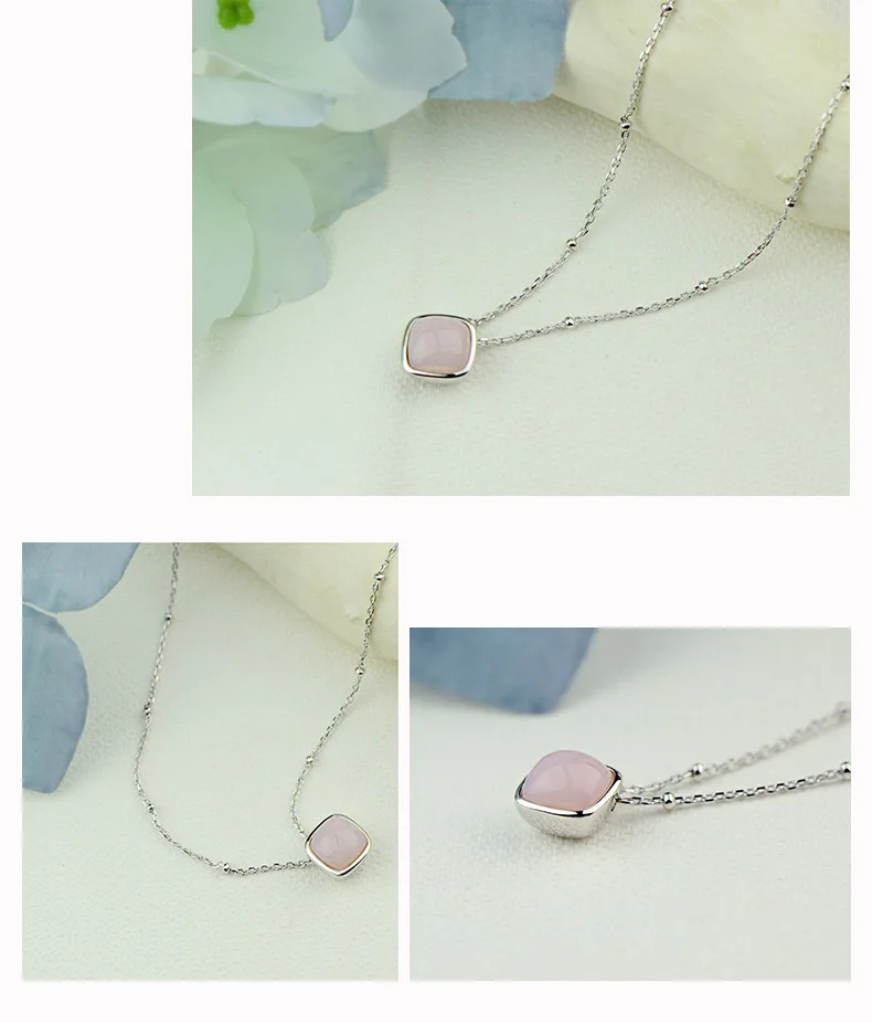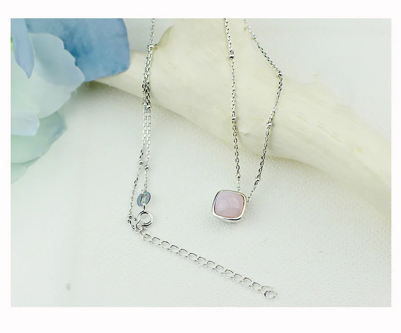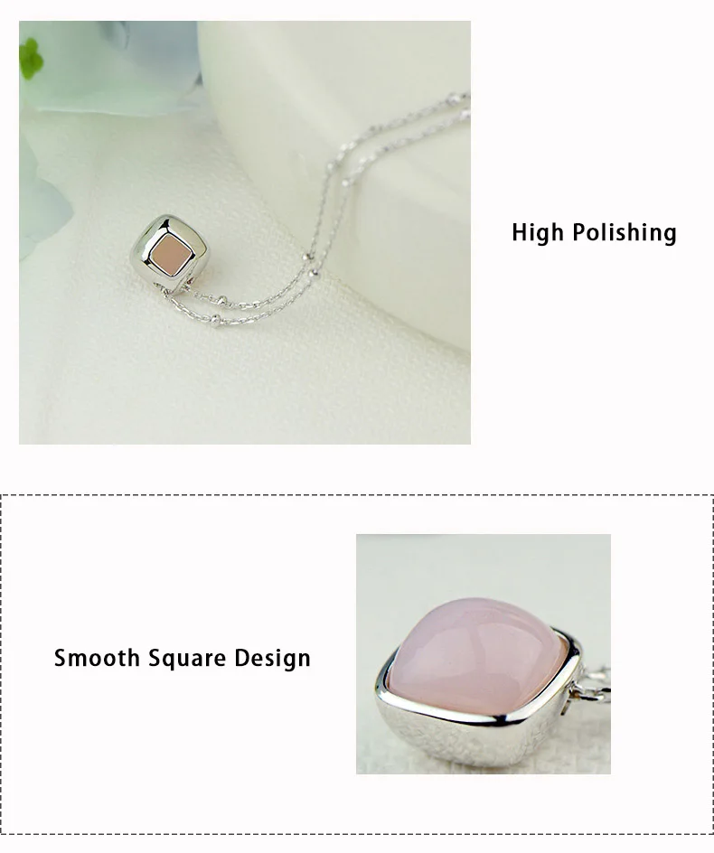 Real 925 Sterling Silver Jewelry Natural Aquamarine Stone Pendant Choker Necklace Chain For Women Pink Color Suqare Shape