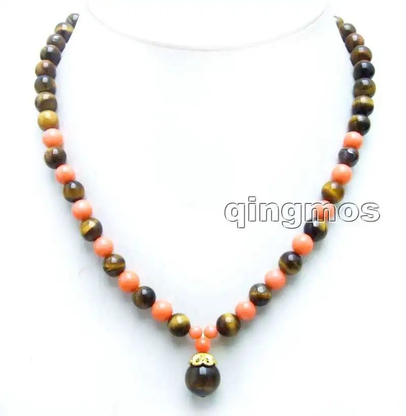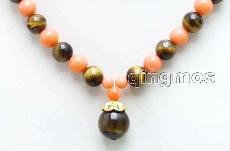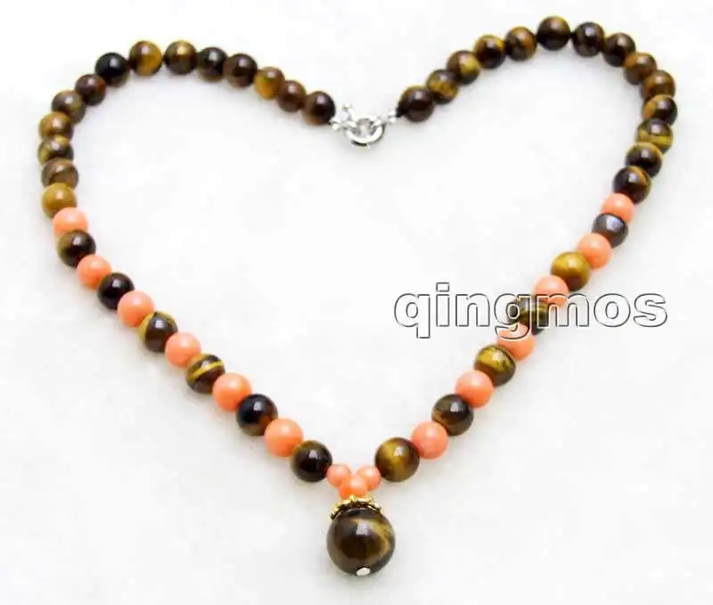 SALE 6-7mm Pink Round Coral & 8mm tiger's-eye 17'' Necklace and 12mm tiger's-eye pendant -nec6046 Wholesale/retail Free shipping