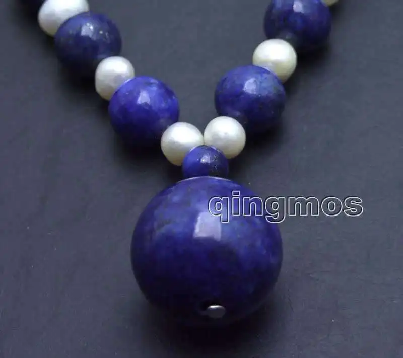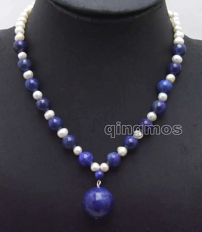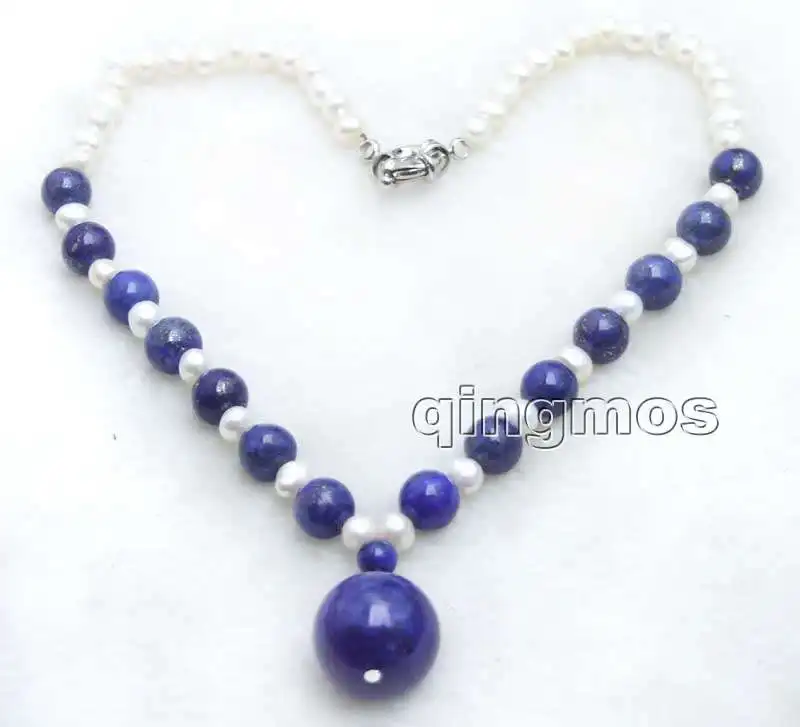 SALE 6-7mm White Pearl & 8mm blue lapis lazuli and 20mm lapis lazuli Pendant 17" necklace-nec5992 Wholesale/retail Free shipping