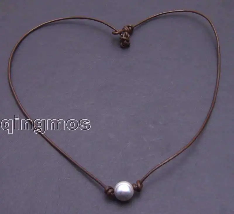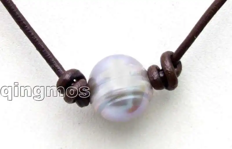SALE Big 10-11mm Gray Potato Natural Freshwater Pearl Necklace 18" with brown Genuine Leather-5906