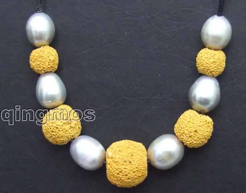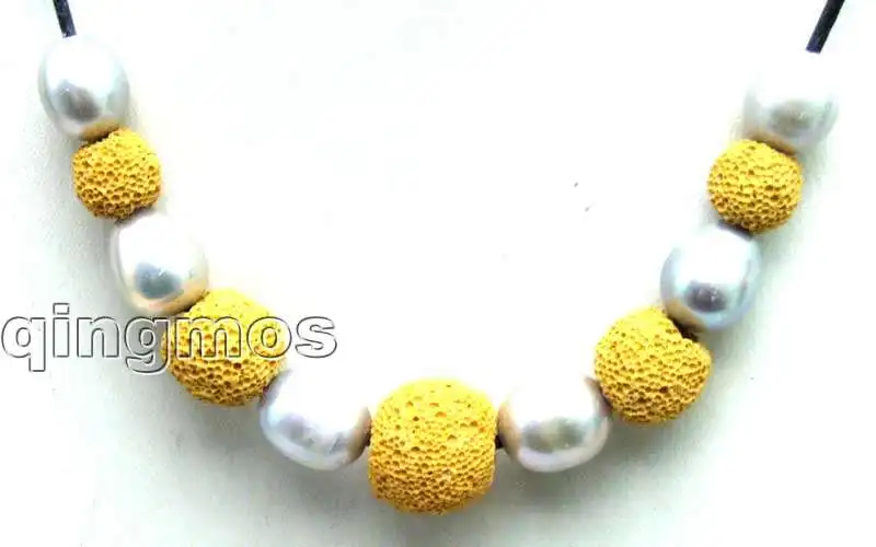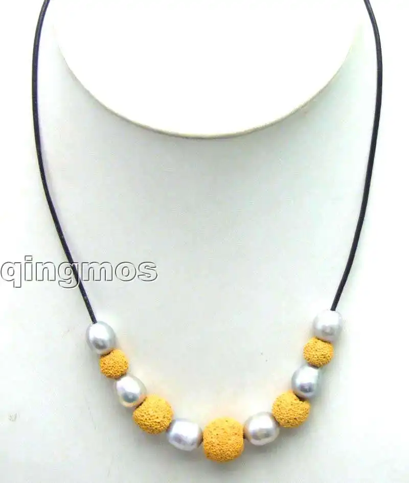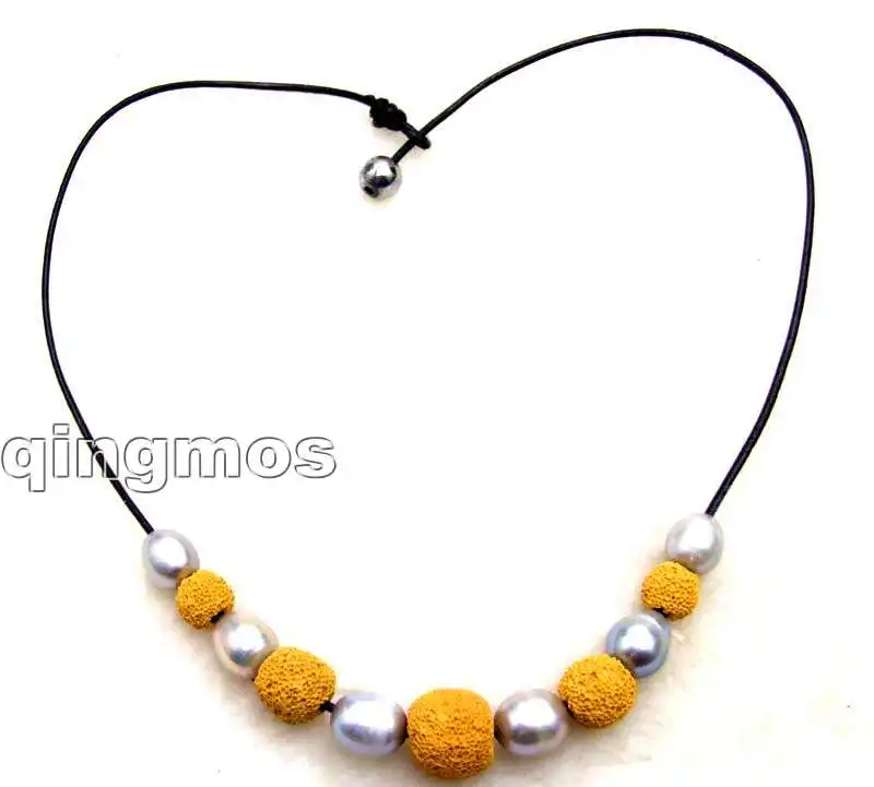 SALE Big 10-11mm Gray rice Natural Freshwater Pearl with yellow Lava rock Necklace 18" with Genuine Leather-5911