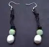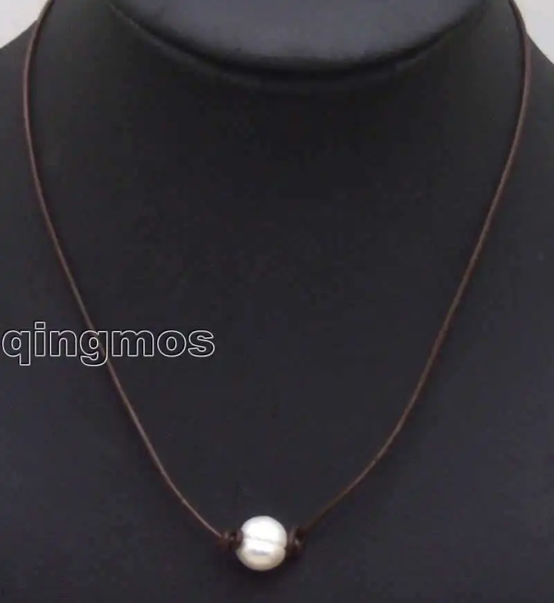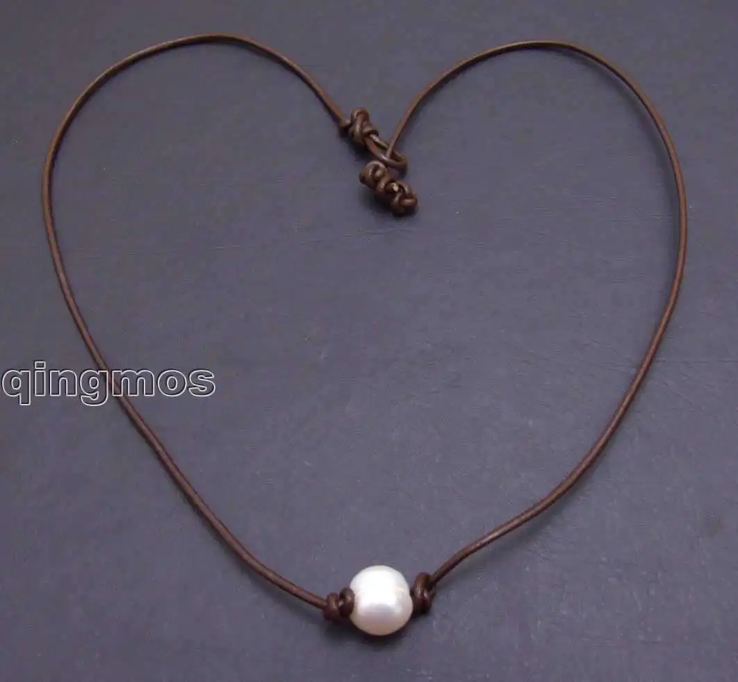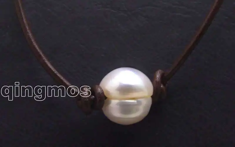 SALE Big 10-11mm White Potato Natural Freshwater Pearl Necklace 18" with brown Genuine Leather-5904